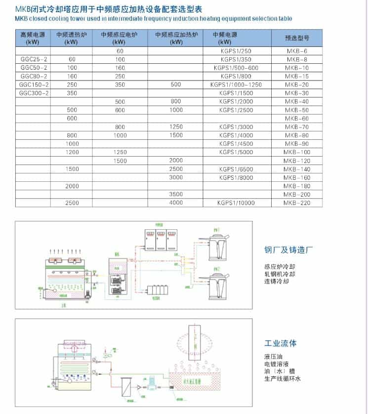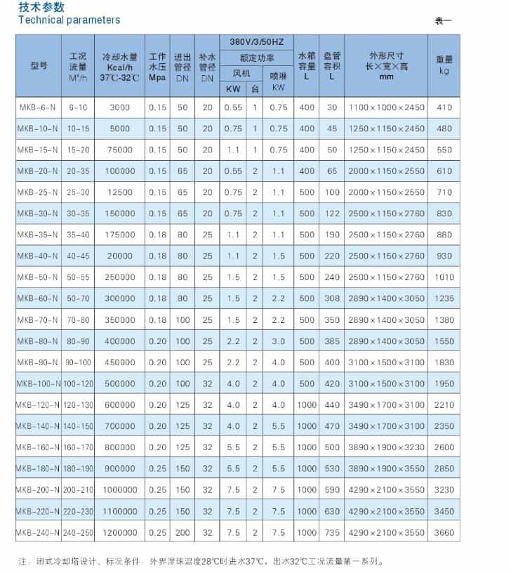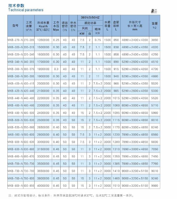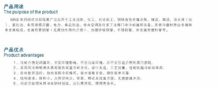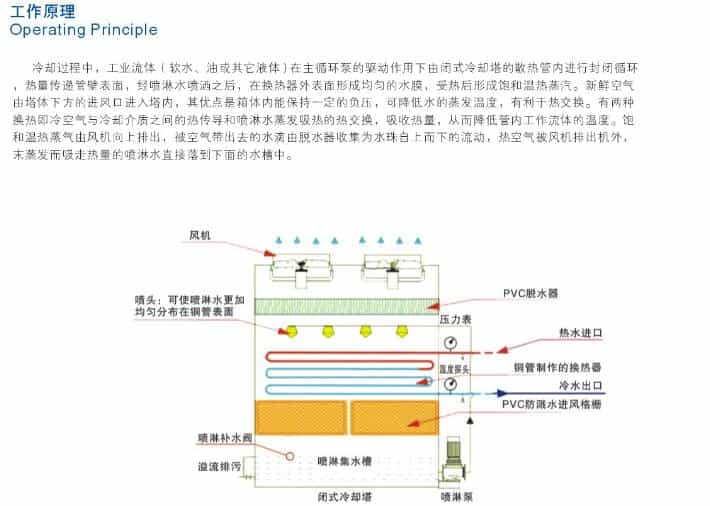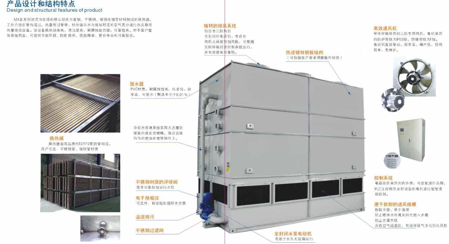 MKB系列閉式冷卻塔的核心部件為紫銅。不銹鋼,碳鋼無縫管材料制成的換熱器,工作介質在管內流過,熱量傳過管壁,經外循環水與強制對流的空氣充分進行熱交換將熱量排除設備。該設備換熱效率高,耐腐蝕能力強,可靠性高。對于客戶整體系統而言,可提供節能環保,有效換熱,低故障率,更長壽命的可靠服務。